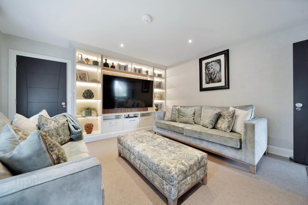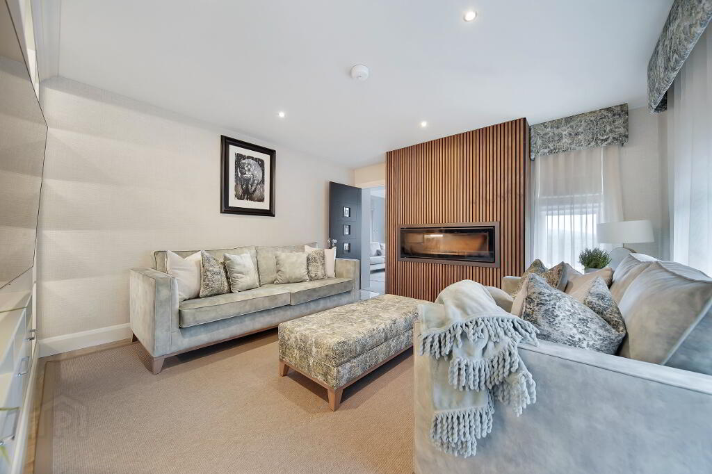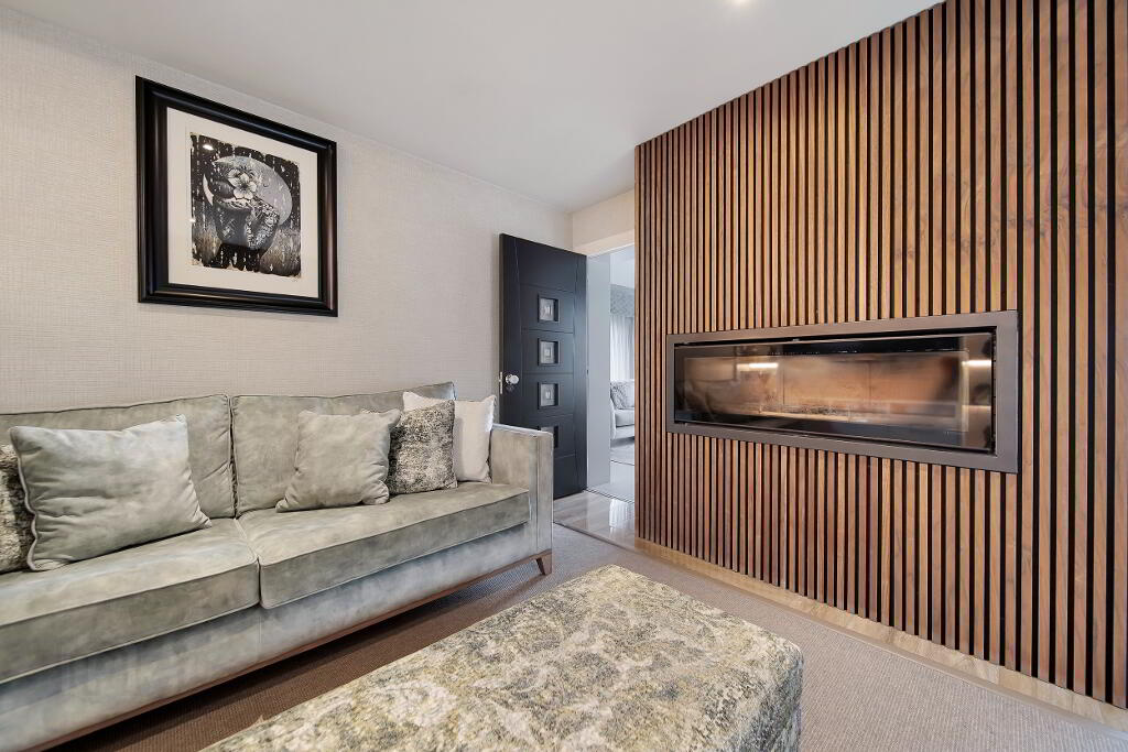 LOUNGE: 4.46m x 4.12m Media feature wall with lighting, inset stove, feature panelling, carpet flooring