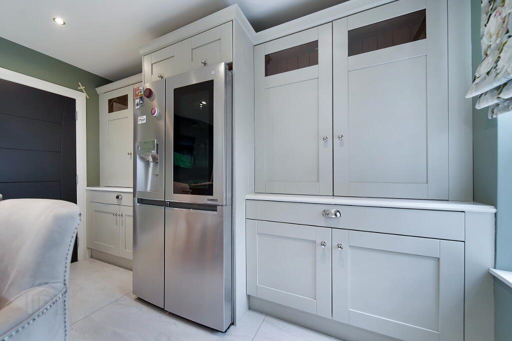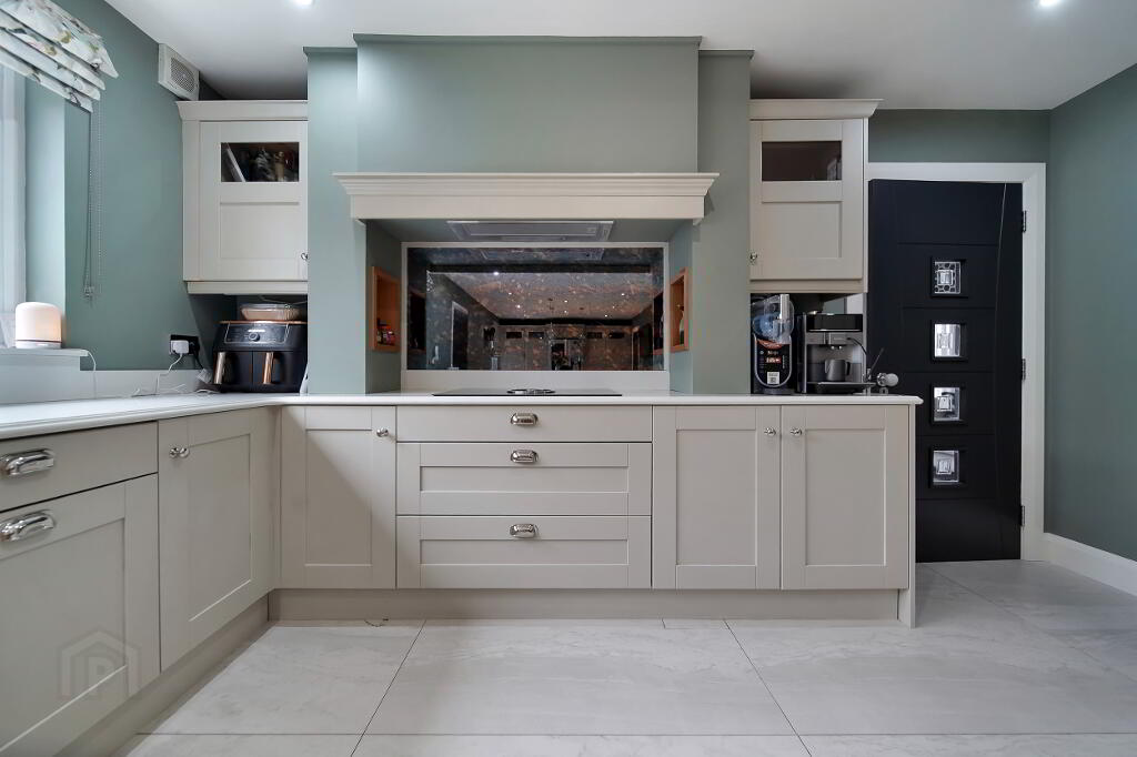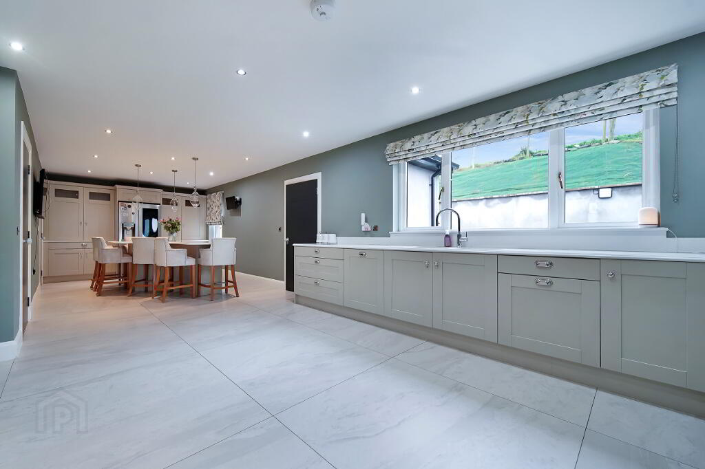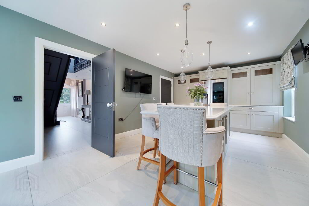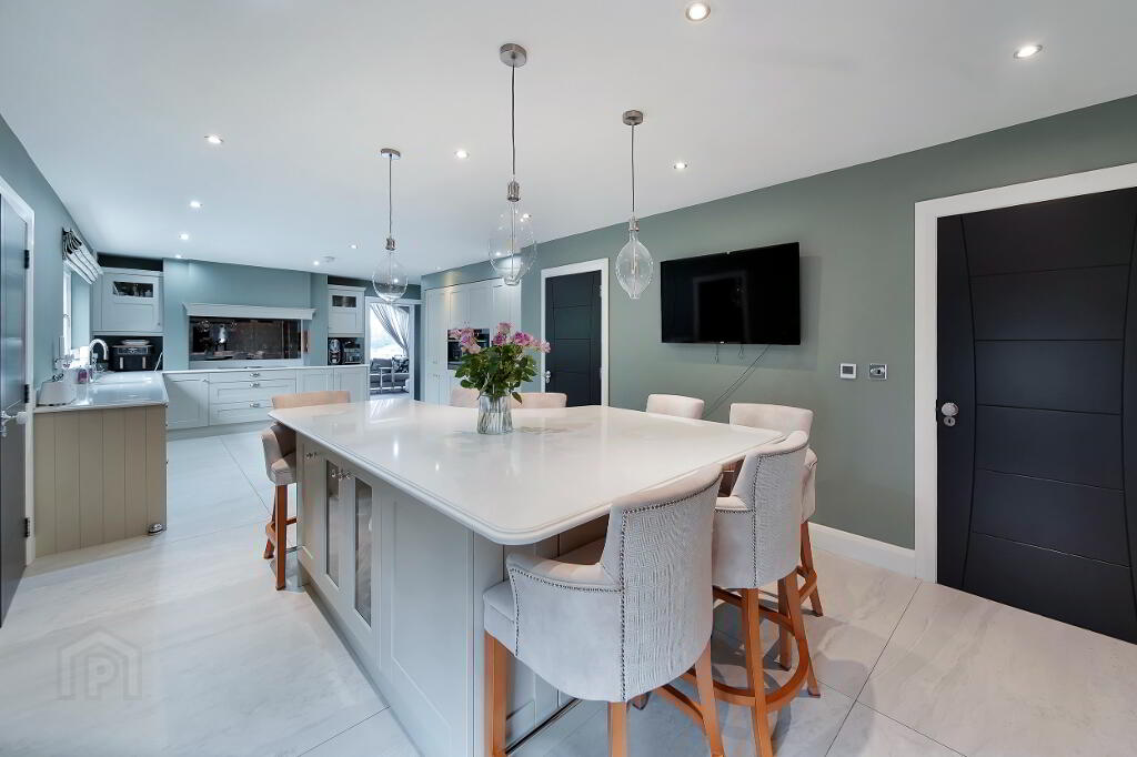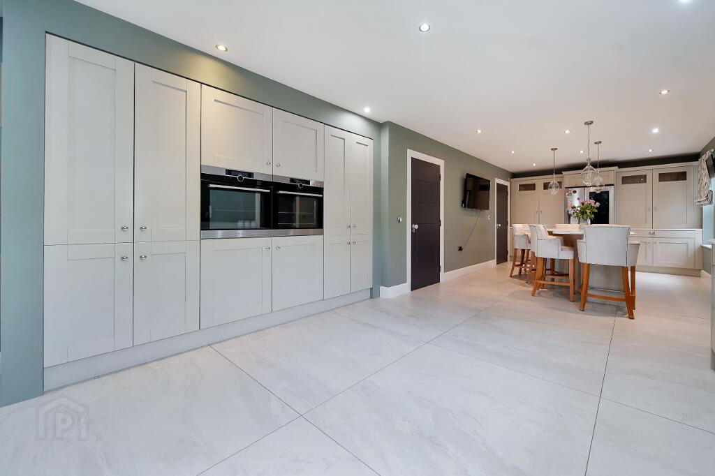KITCHEN / DINING AREA: 9.77m x 4.29m Luxury crafted bespoke shaker style painted fitted kitchen units with large island, seating, quartz work surface, up stands, sink unit,larder cupboard, integrated AEG appliances including dishwasher, 2no ovens, induction hob, Quooker hot tap, provision for larder fridge/ freezer, tile floor, glass panel doors to sun room