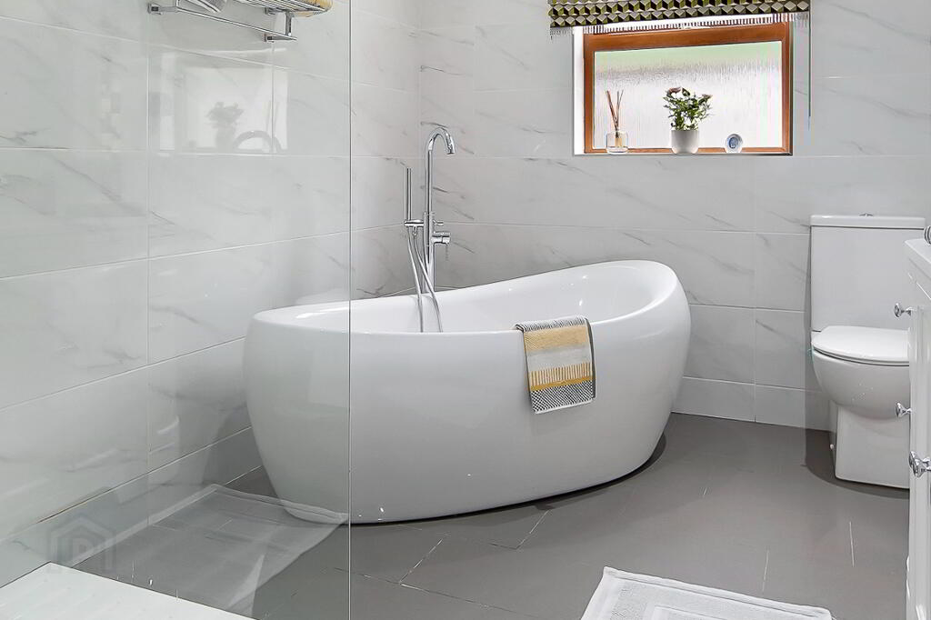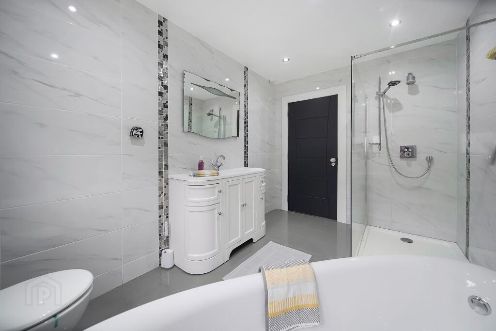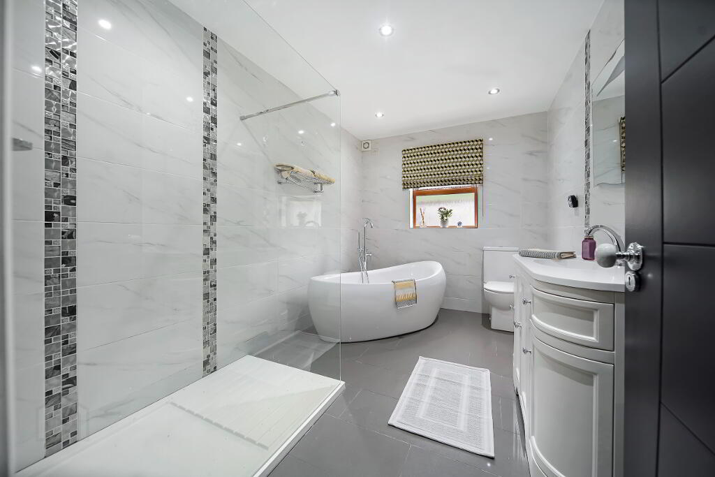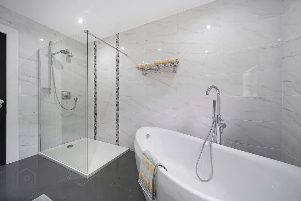 BATHROOM: 3.54m x 2.35m White suite with vanity, wc, large walk-in shower unit, , free standing bath, wall & floor tiles