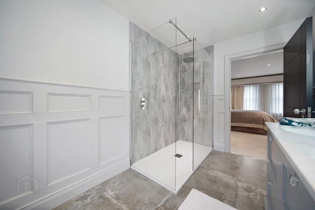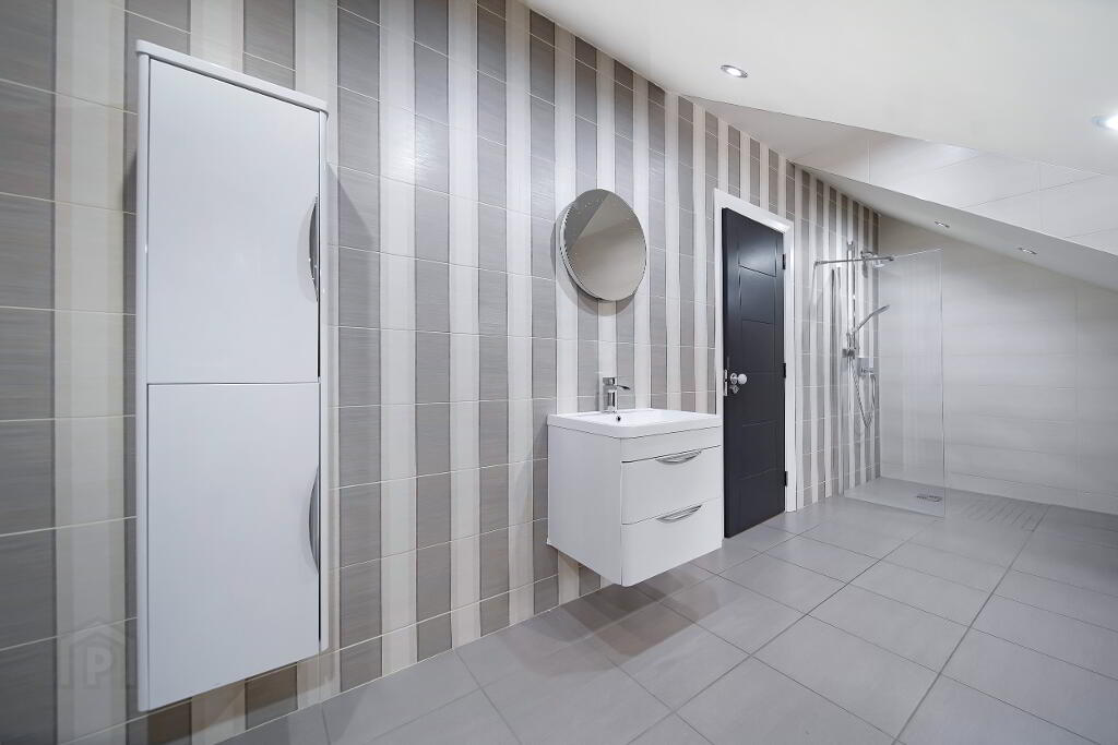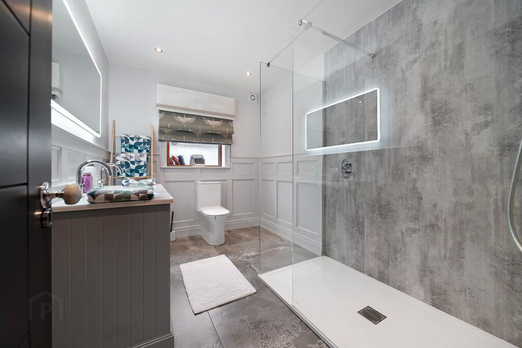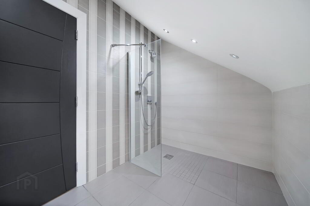 SHOWER ROOM: 5.34m X 2.55m White suite with vanity unit,wc, large walk-in shower, wall & floor tiles
