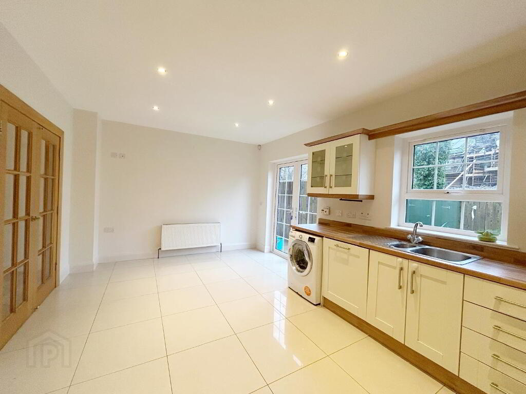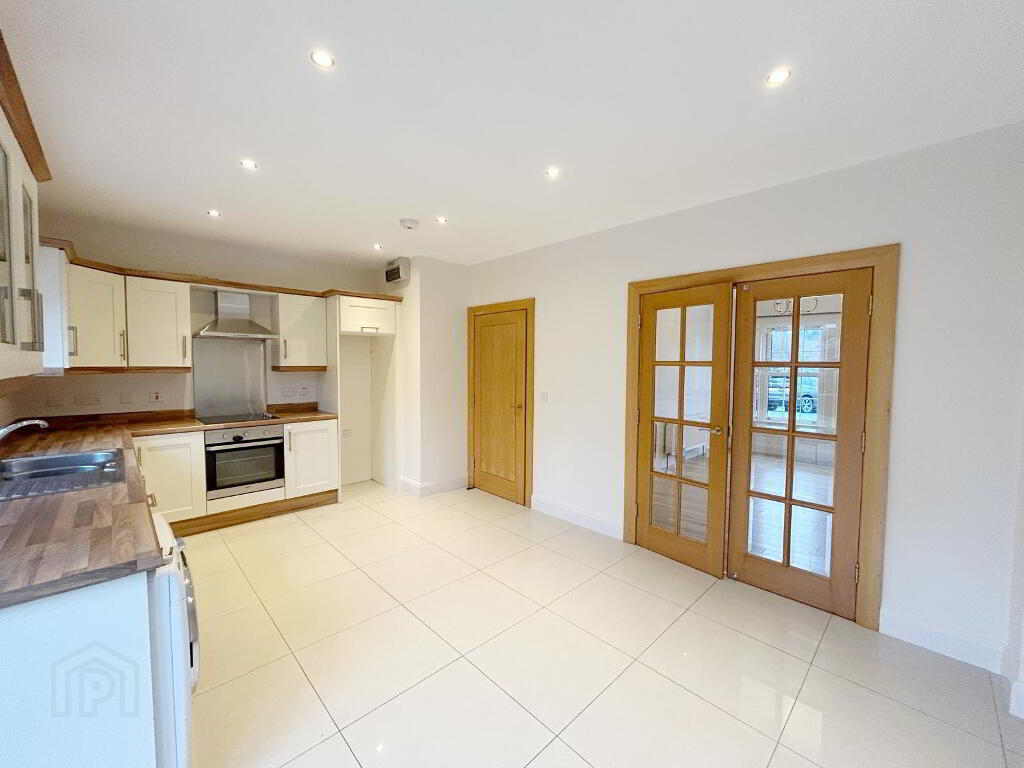 KITCHEN/DINETTE: 5.51m x 3.49m Modern kitchen/dinette with a range of high and low level units with integrated electric oven, hob & extractor fan. Dishwasher, stainless steel sink and drainer board. French Upvc double patio doors leading to rear garden. Double French doors opening to living area from dining area. Tile flooring.