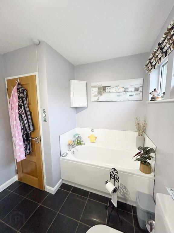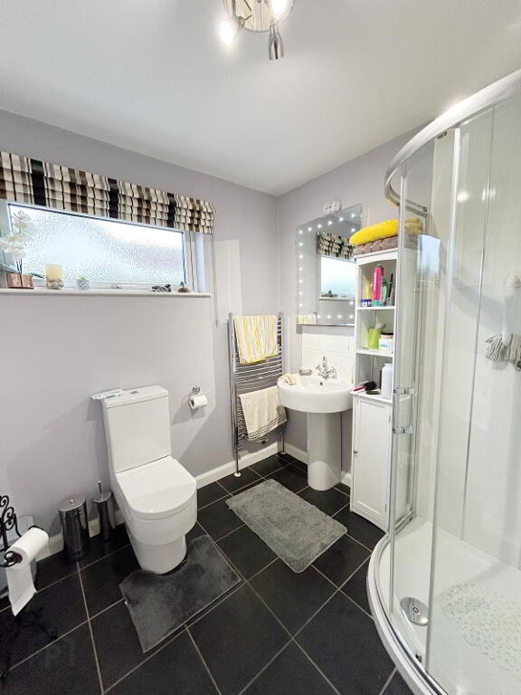 BATHROOM: 9’8’’ x 7’11’’ (LP) White suite with bath & separate electric shower, wc, whb towel rail, fitted cabinet, walls partially tiled ,pvc panelling , floor tiles