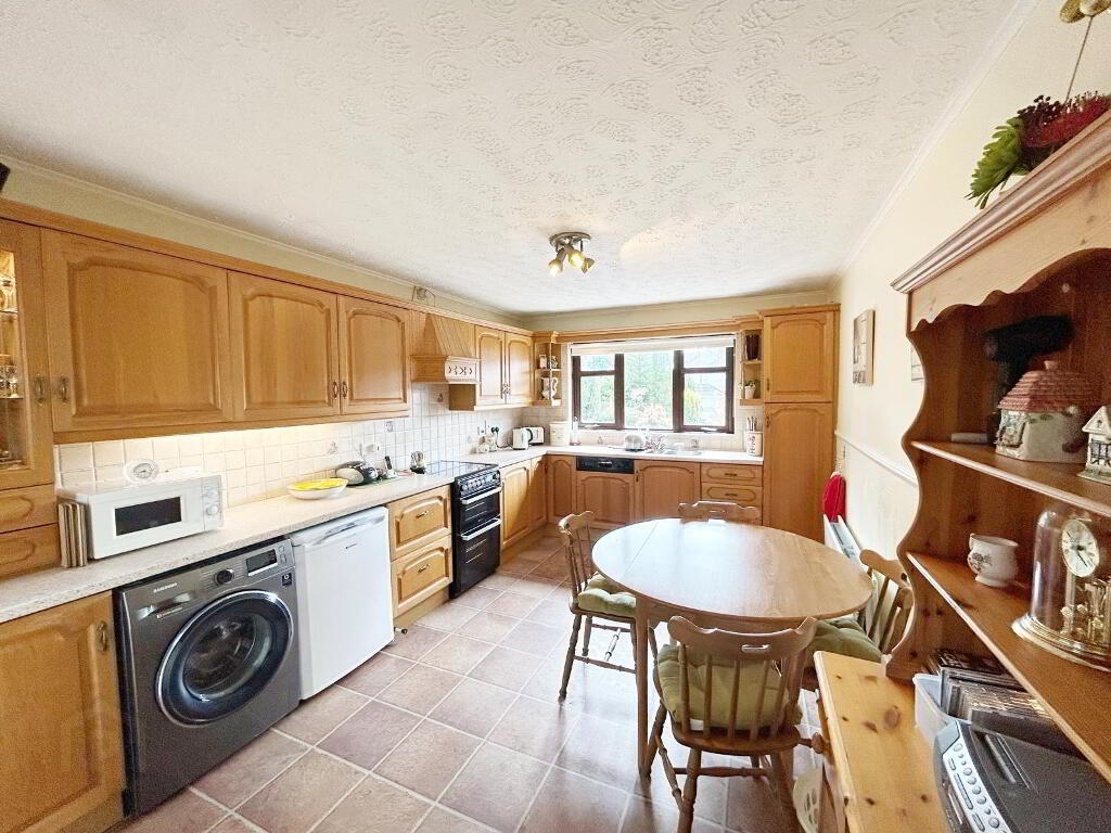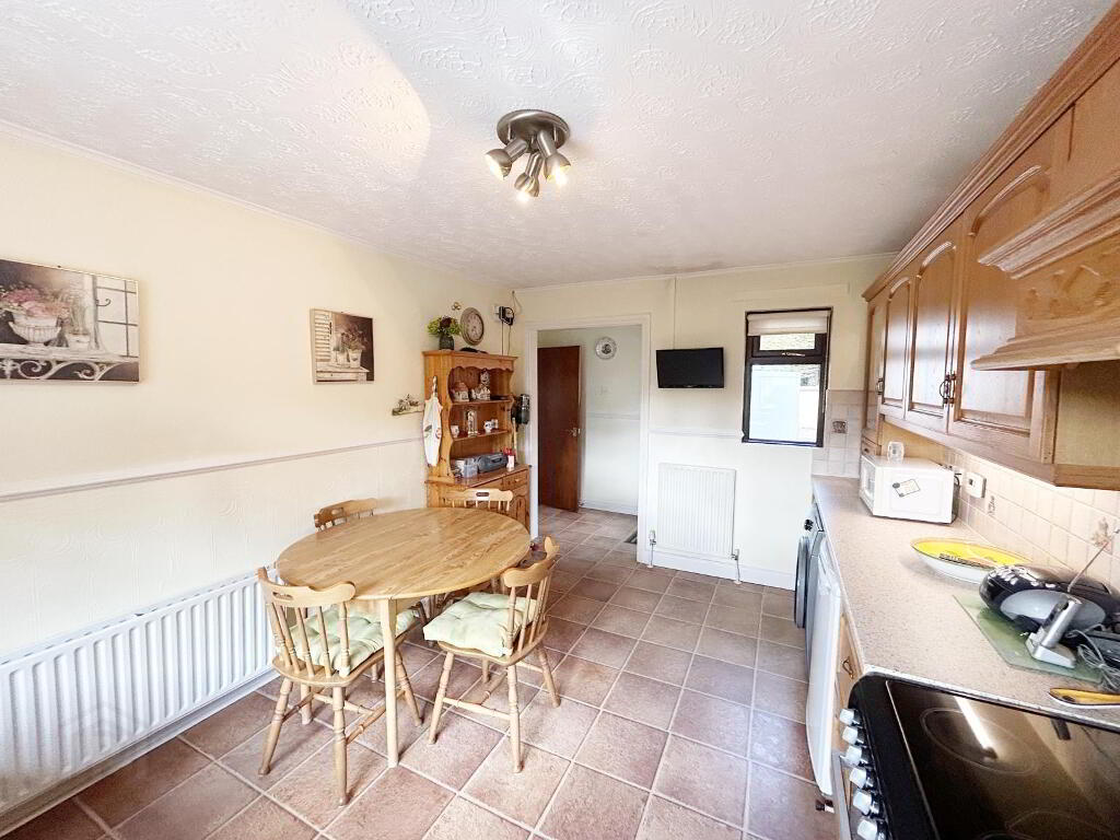 KITCHEN/ DINING AREA: 4.65m x 3.15m - High and low level fitted kitchen cupboards with laminate work surface & tile upstand, provision for electric cooker & hob, dishwasher, washing machine, fridge/freezer, extractor fan, stainless steel sink unit, door, vinyl floor