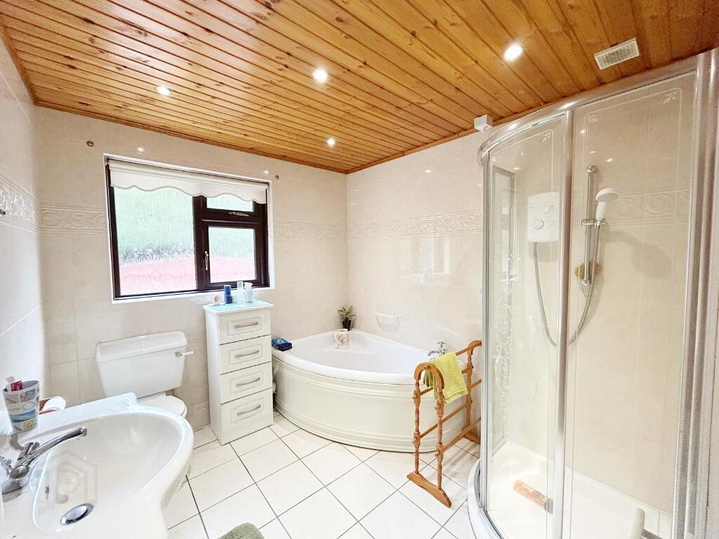 BATHROOM: 8'8" x 8'8" White suite with corner bath, separate shower electric unit, wc, whb, wall & floor tiles