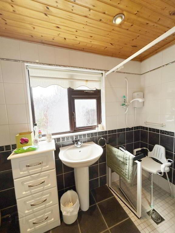 WETROOM: 2.80m x 1.2m White suite with level access electric shower, wc, whb,wall tiles,vinyl floor