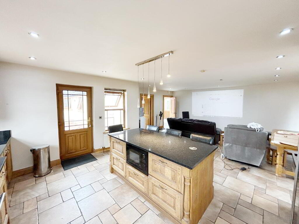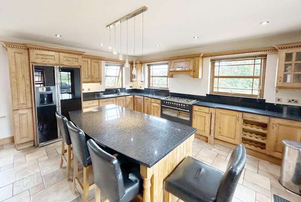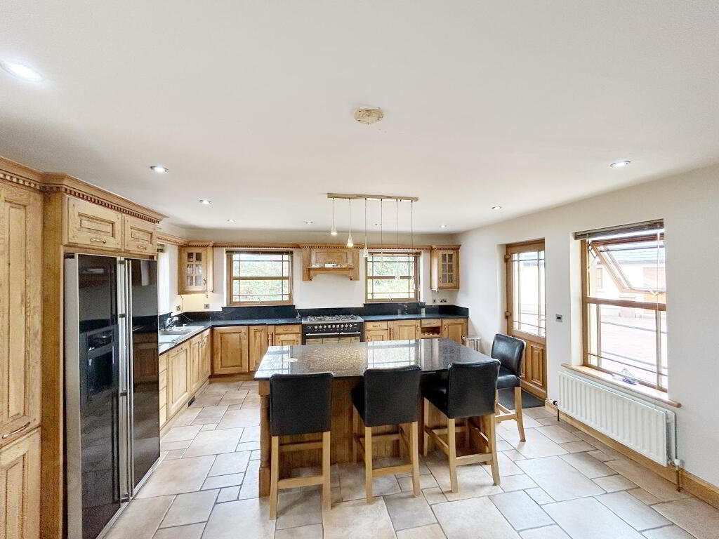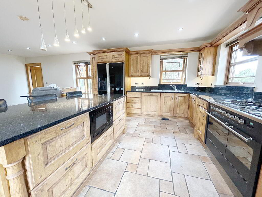 KITCHEN/ DINING & SITTING AREA: 8m (lp) x 6m (wp) Luxury fitted high & low level wooden units with dark granite work surface & upstand , kitchen island with recessed sockets, provision for range style cooker (gas), provision for fridge/freezer, dishwasher, sink, tile flooring