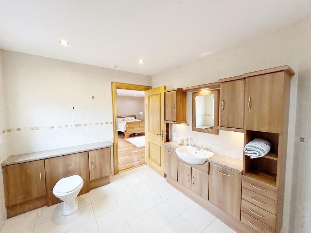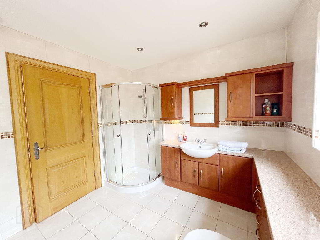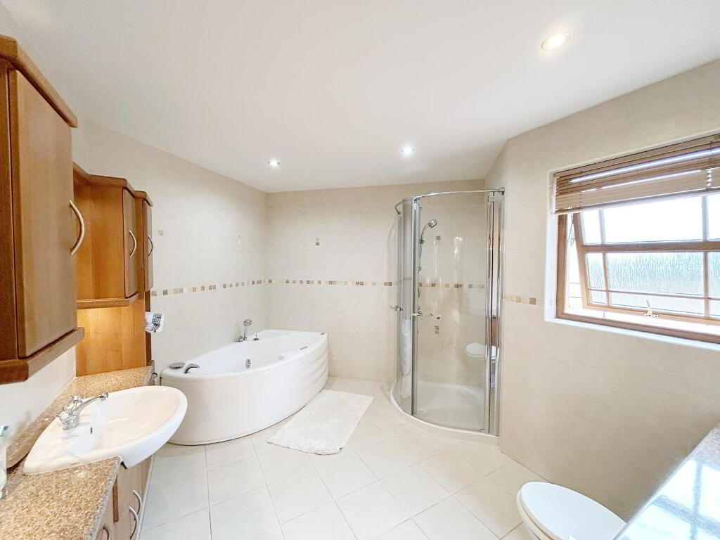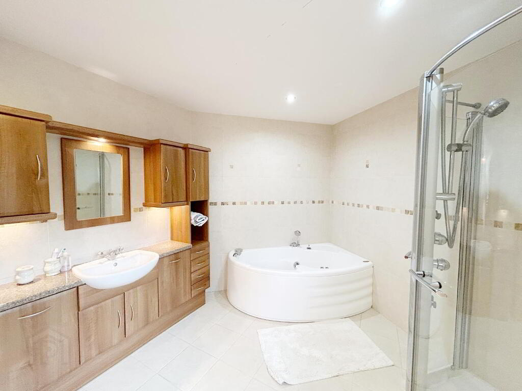 ENSUITE: 4m x3m White suite with jacuzzi corner bath , separate quadrant shower unit, wc, vanity unit