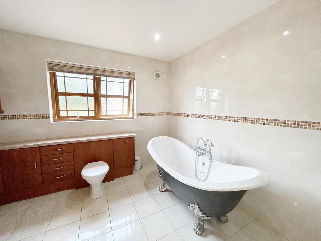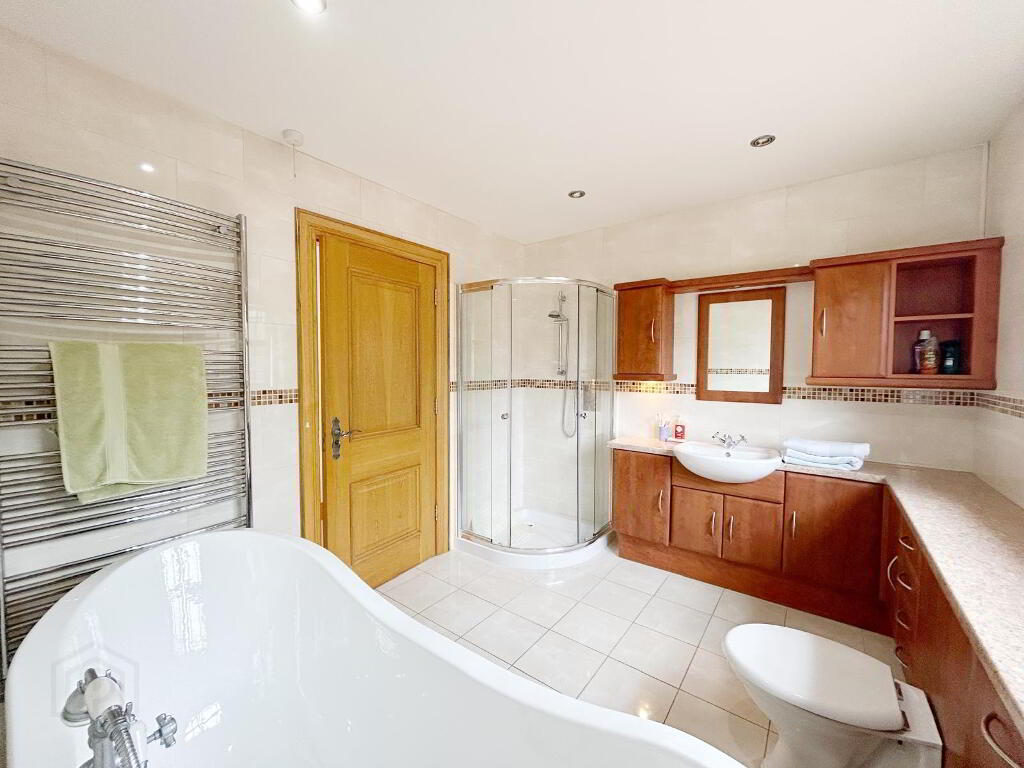 BATHROOM: 3.15m (lp) x 2.80 (wp) White suite with free standing bath, separate quadrant shower unit, heated towel rail, wall & floor tiles