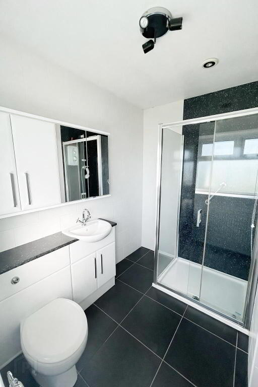 Shower Room – 2.45m (LP) x 2.3m (WP) White suite with large electric shower, fully tiled walls and floor.