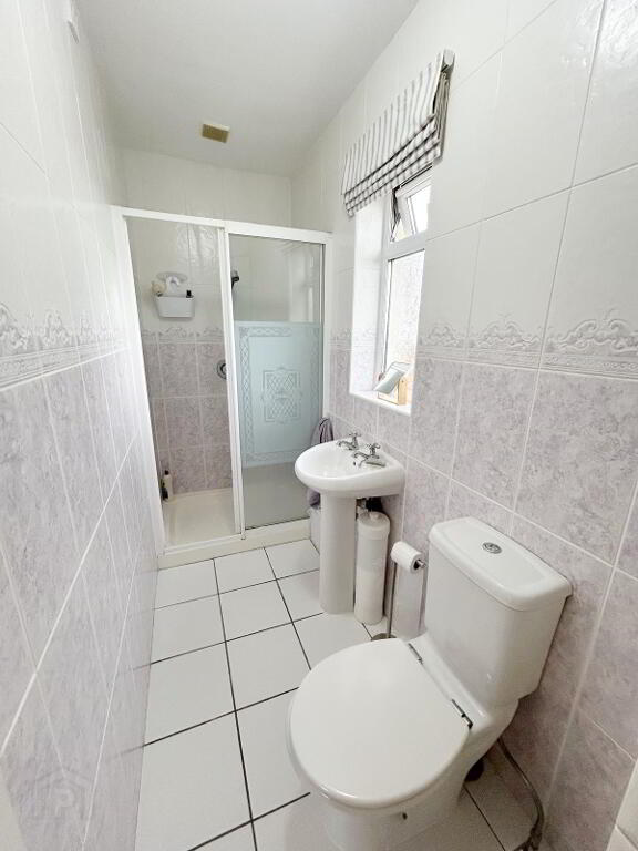 WC:2.1m x 1m White sanitary ware, partial wall tiles, vinyl floor