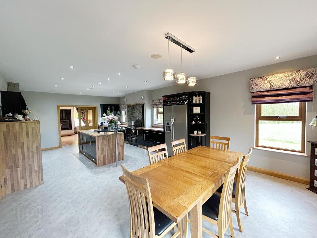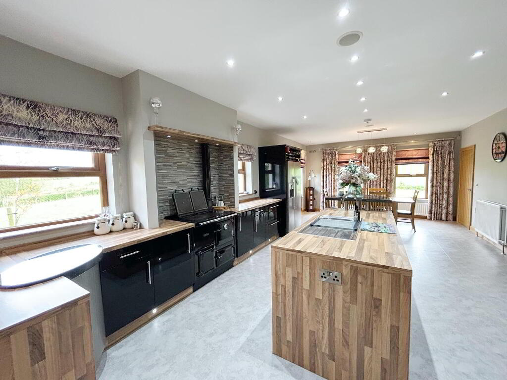 OPEN PLAN KITCHEN/ DINING AREA: 8.35m x 4.45m Luxury bespoke high and low level fitted kitchen units with large island unit,integrated dishwasher, electric oven & hob, provision for Rayburn cooker, large fridge/freezer, tiled floor
