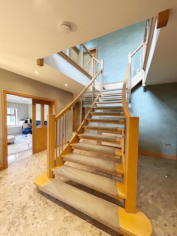 ENTRANCE HALLWAY: 7.25m (lp) x 4.5m(wp) Feature Oak staircase with glass balustrade, composite flooring,
